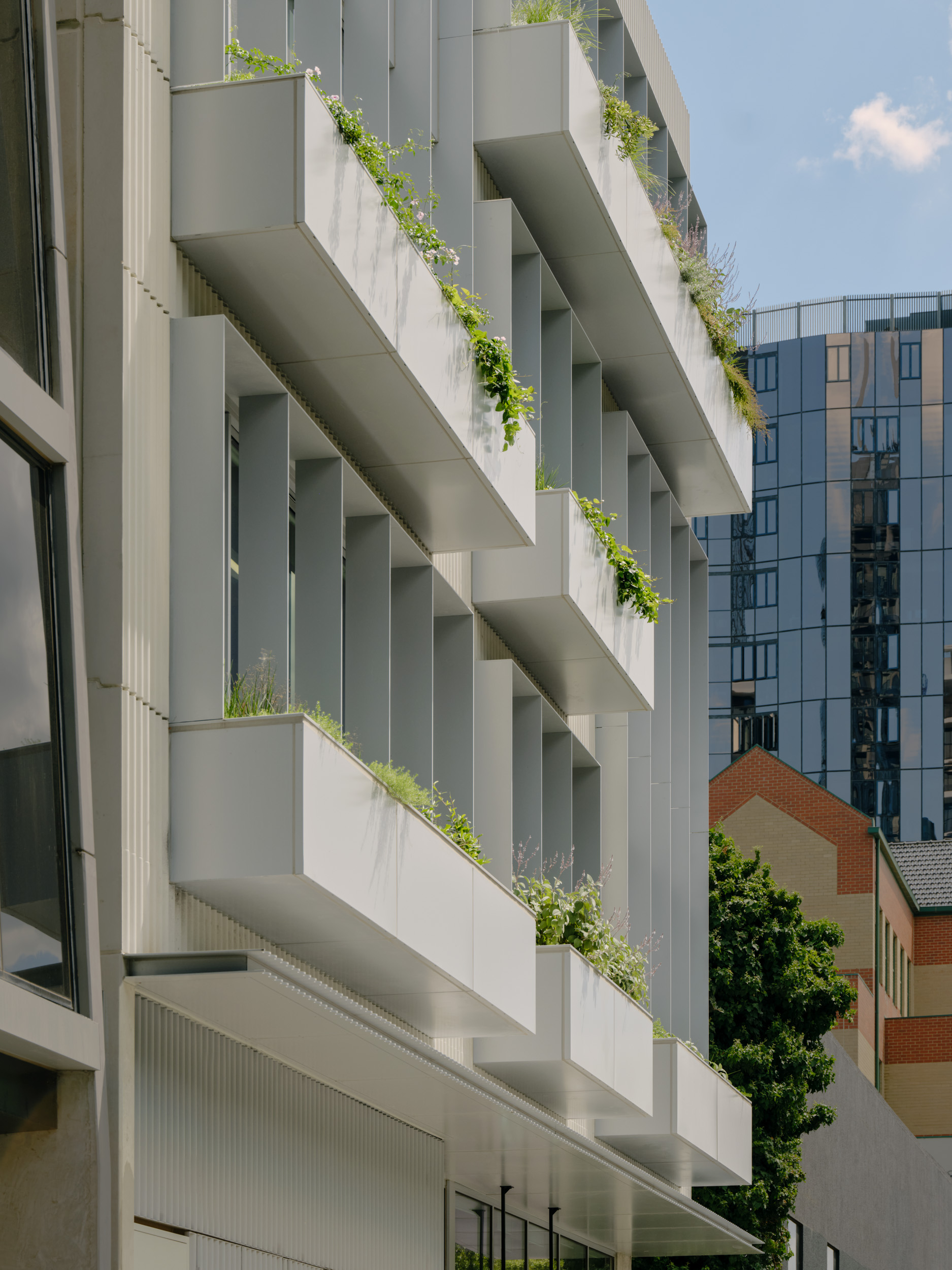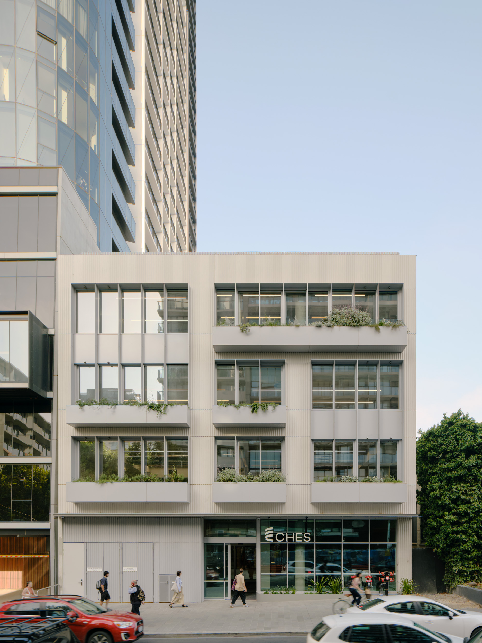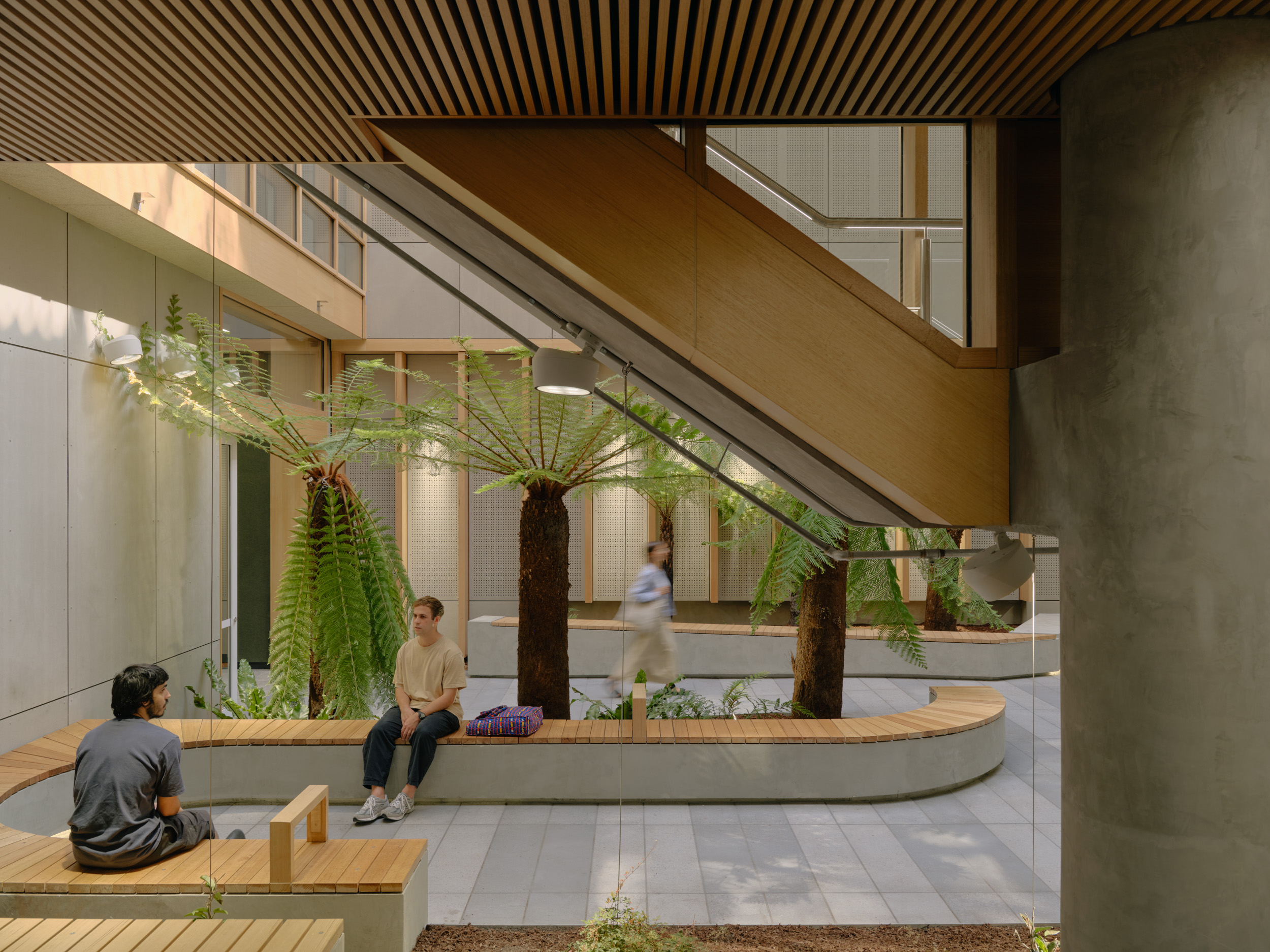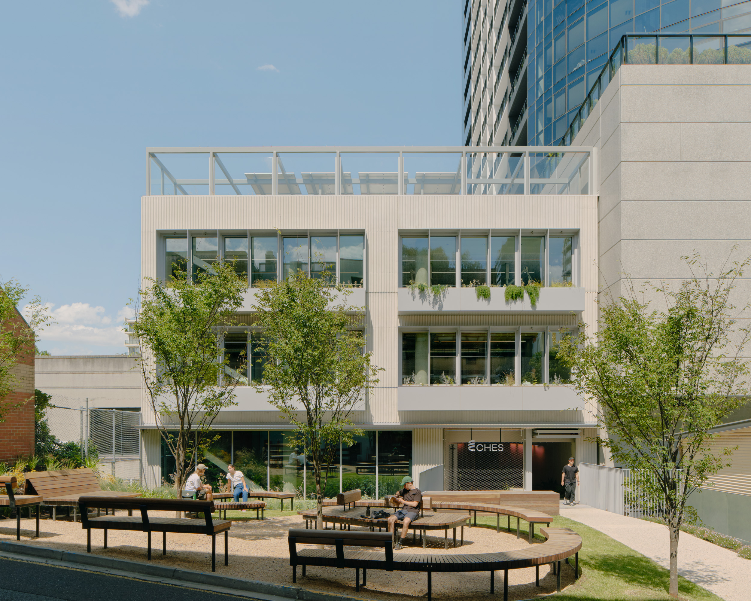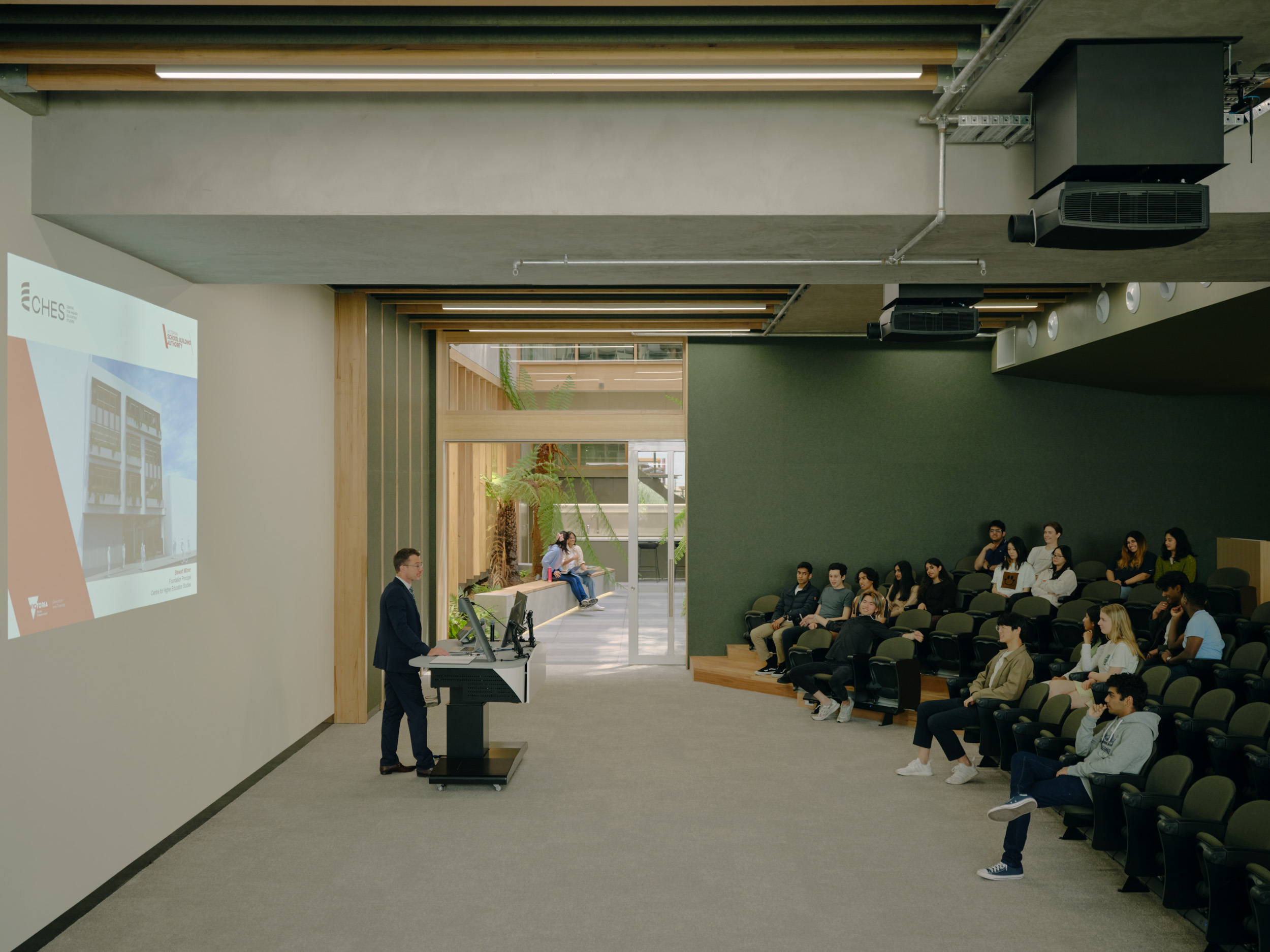 CHESThe Centre for Higher Education Studies (CHES) in South Yarra is a state-of-the-art, multi-level educational facility designed and constructed by Figurehead. This innovative building features four levels of integrated learning spaces, including specialist laboratories, customised classrooms, breakout areas, and a 275-seat auditorium. A highlight of the project is its advanced ETFE inflatable roof system, which enhances thermal insulation, natural lighting, and overall sustainability. One of the key challenges in constructing CHES was the integration of Glulam timber (GLT) beams with precast concrete panels. Figurehead overcame this by re-sequencing the construction process, ensuring GLT beams, which are susceptible to moisture damage, were installed only after the building was watertight. By using double-height precast panels to minimise crane lifts and carefully coordinating installation timing, the team delivered a structurally sound and sustainable facility where GLT beams provide striking long spans and a distinctive architectural feature.